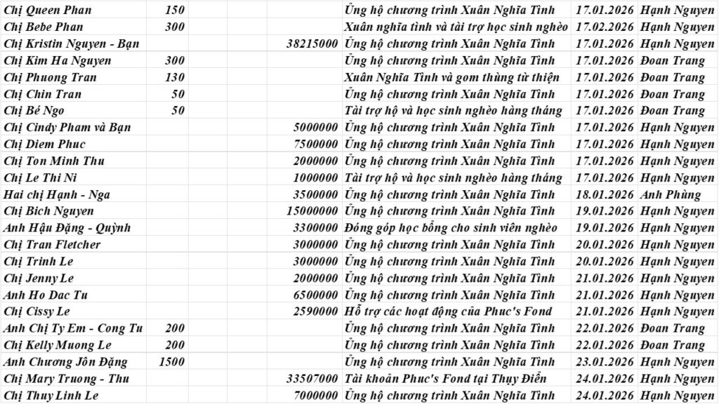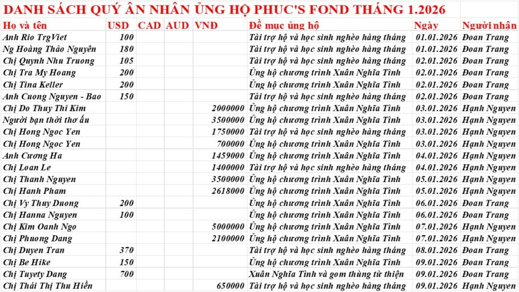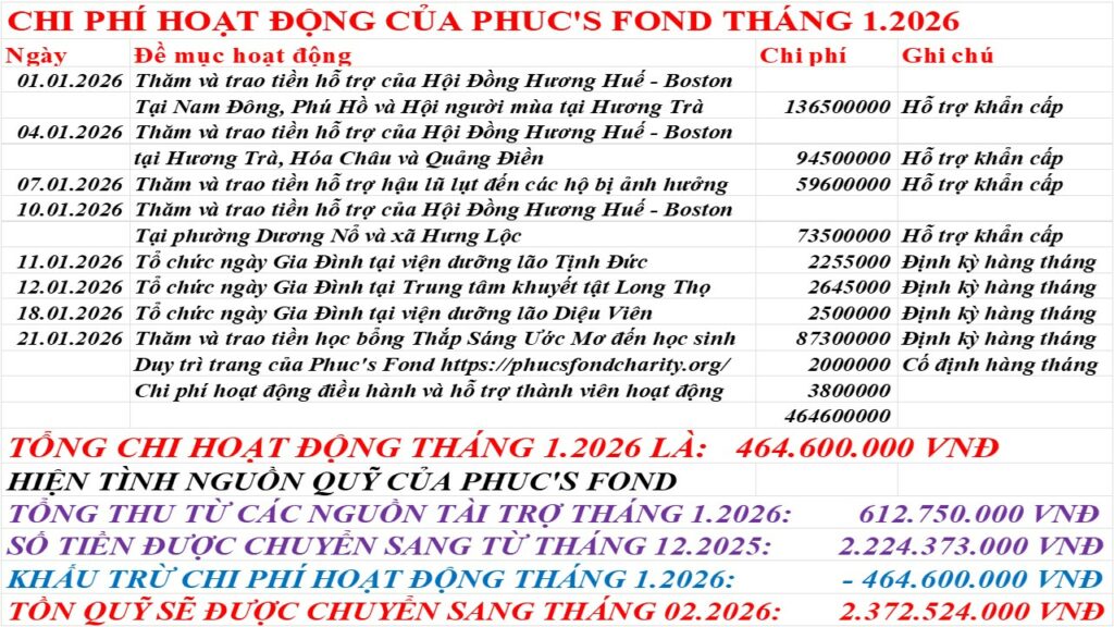 Januar kom raskt og forsvant like raskt, men sporene etter de mange meningsfulle aktivitetene for å spre kjærlighet fra Phuc’s Fond er fortsatt tydelig til stede. Mer enn 350 vanskeligstilte husholdninger ble besøkt av Phuc’s Fond på vegne av Thừa Thiên Huế-foreningen i New England, og mottok økonomisk støtte personlig etter flomkatastrofen.