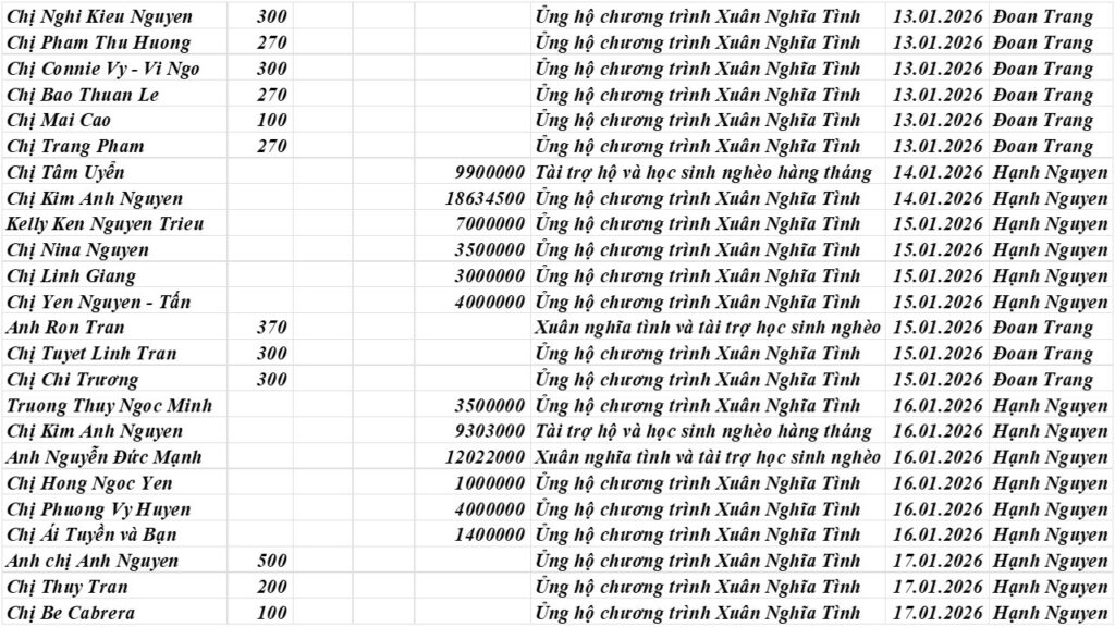Som vi ofte understreker, er Phuc’s Fond riktignok formelt anerkjent som en utenlandsk ikke-statlig organisasjon (INGO) i Vietnam, men vårt arbeid bæres i hovedsak av giverglede, solidaritet og medmenneskelighet fra mennesker med varme hjerter. Selv om januar er over, sitter vi igjen med utallige øyeblikk av glede – ekte, varme smil fra mennesker vi har fått møte. Dette er den mest verdifulle bagasjen for hjerter som evner å elske og vise empati. Februar, deretter mars, og videre gjennom livets mange måneder… Vi håper inderlig at dere fortsatt vil stå sammen med Phuc’s Fond og følge oss i arbeidet, i tråd med vårt motto: «HELP TO HELP – Å HJELPE ANDRE FOR Å SPRE KJÆRLIGHET.»